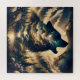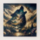 Imagen dentro de una imagen. Un lobo aullando en la luna con un fondo de montaña y bosque.