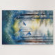 A beautiful image featuring three bluebirds in a woodland forest with soft misty lighting and a feel of surrealism and/or fantasy. Lovely puzzle to make into artwork.