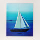 Rompecabezas en el arte abstracto, minimalista poster de un yate en el mar, sobre un fondo cobalto y azul ceruleño del océano