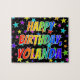 Este animado y vibrante diseño de rompecabezas con temática de cumpleaños tiene el mensaje "FELIZ CUMPLEAÑOS, YOLANDA" con los personajes con un colorido patrón de gradiente inspirado en el espectro arcoiris, junto con un divertido patrón de fondo de estrellas. Un acertado rompecabezas como este podría ser usado para enviar un mensaje de bienvenida de cumpleaños a alguien llamado Yolanda. [~Z0000468]