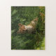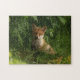 Un rompecabezas con una fotografía que muestra un lindo zorro bebé de piel roja y blanca. Rodeado de hojas y hierbas verdes.