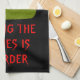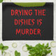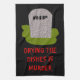 Esta impresionante toalla de cocina tiene una lápida gris con RIP en gotear texto negro sobre ella, parado en un parche de hierba verde. A diferencia de este diseño mórbido, el fondo es negro. Hay un gracioso texto de personalizable rojo que dice "Secar los platos es asesinato"