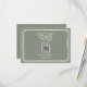Boda RSVP con marco rojo y ilustracion floral sobre fondo verde sabio con texto rojo en la parte delantera y trasera. Personalice el texto y el código QR.