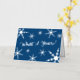 Elegante tarjeta navideña presenta "¡Qué año!" en un gran guión manuscrito plateado rodeado de brillantes copos geométricos de nieve de varios tamaños sobre un fondo azul. Personalizar fácilmente el mensaje y el nombre dentro de la barra lateral. Puede borrar el texto dentro si prefiere escribir sus cartas a mano. Copyright ©Claire E. Skinner.