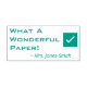 Este positivo diseño de sellos de caucho muestra el mensaje positivo "¡Qué papel maravilloso!" y el nombre de un tutor personalizado. También cuenta con una marca de verificación decorativa. Podría ser utilizado por un profesor o educador escolar al marcar las asignaciones, para reconocer que el estudiante ha hecho un gran trabajo.