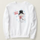 Esta es una sudadera adorable para hombres que muestra a un muñeco de nieve bailando en la nieve con las palabras "Que nieve".