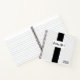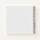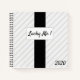 La parte delantera de este cuaderno tiene un fondo de pinstripe gris y blanco con una estrecha franja negra en el medio. En el centro de la franja negra hay una caja blanca con un borde negro con las palabras "Lucky Me" escritas con un tipo de letra negro clásico. La parte trasera del libro tiene una continuación de las franjas de pasadores grises y blancos. En la esquina inferior derecha está el año 2020. Hay páginas gobernadas en este ejemplo, pero tiene una amplia variedad de opciones para el tipo de páginas que desea (en blanco, papel gráfico, regla general, etc.). También puede cambiar el color de enlace en espiral y el tamaño del bloc de notas.