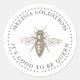 Ilustracion vintage de una abeja de miel reina con fondo blanco y borde circular esparcido. Personaliza con tu nombre o colmena. Ideal como sellos para sobres, o para etiquetar equipos de apicultura con su identidad para evitar mezclas o pérdidas.
