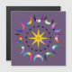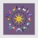 Pride crescent moons surround a yellow 8 pointed star and a ring of black hearts. Purple background.