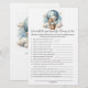 Con el tema de la aventura, "Cómo de bien sabes que es la mami", tarjeta de juego para la ducha de bebé con un adorable cachorro blanco sosteniendo a un oso de peluche montando en un globo azul de aire caliente. El cielo azul acuático tiene nubes blancas con estrellas doradas que lo rodean. Plantillas en la parte posterior.