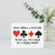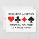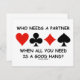 Una actitud sugestiva y sarcástica irónica cobra vida en cualquiera de estos regalos que presentan los cuatro trajes de cartas y hace la siguiente pregunta: "¿Quién necesita un compañero cuando todo lo que se necesita es una buena mano?" Regalos para todos los jugadores de bridge que deseen no necesitar un socio para jugar bridge y que entiendan que, a veces, en la mesa del puente, sólo se necesita una buena mano para ganar!