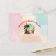 Postal navideña divertida con Santa relajándose en una isla con las palabras "Quiero Navidades isleños este año".