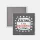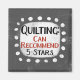Un divertido diseño tipográfico que dice "Quilting: Can Recomendd, 5 Stars". Es texto en negro y rojo sobre un rectángulo blanco con puntos blancos divertidos y juguetones rodeándolo, todo sobre un fondo gris.