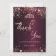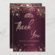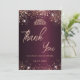 Una tarjeta de agradecimiento por una Quinceañera, 15 cumpleaños. Un color de fondo burdeos profundo. Con rosa purpurina de imitación de oro, chispas y una tiara. Delante de una gran escritura con letras a mano y el texto: Gracias, tu texto, título y una fecha. Atrás: Personaliza y agrega tu nota de agradecimiento y nombre.