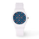 Un reloj de pulsera deportivo blanco de moda, con un patrón de extravagantes puntos de polka jumbo en rojo, verde y amarillo, en un fondo azul marino que se puede cambiar si se desea. Este patrón, que forma parte de la colección "Rangoli" de Posh & Painterly, se puede ajustar para que se ajuste a cualquier reloj de pulsera.
