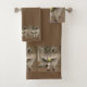 Raccoon sobre un juego de toallas de baño de fondo marrón. Va con muchos otros elementos de la colección para Raccoon Lovers.