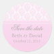 Elegante y sofisticado Radiant Glam Damask Save the Date Pegatinas en rosa claro. Estos sencillamente lujosos estampados salvan la fecha de pegatina es una manera glamurosa y creativa de hacer saber a sus amigos y familia de su próximo boda. Personalizar este diseño agregando los detalles de su boda!