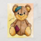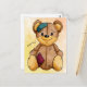 Oso de peluche de rag acuarela con parches morados y azules un cuerpo marrón y pies morados y orejas sobre un fondo de acuarela naranja y amarillo. A su izquierda en un pequeño texto negro están las palabras ¡Señorita usted!
