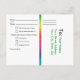 Un diseño sencillo pero elegante y llamativo que pone su importante centro de información en un estilo fácil de leer. El fondo sólido bordeado por una salpicadura de color arcoiris hace que esta postal resalte realmente en el buzón. Elige cualquier color que quieras para el fondo (se muestra aquí con verde en la parte delantera y blanco en la parte posterior). El reverso tiene un formato previo para que introduzca su dirección de retorno para enviar el RSVP de vuelta a. Deje el campo Destinatario en blanco si prefiere dirigirlo a mano. Utilice los prácticos campos de plantilla proporcionados para personalizar rápidamente su información. Haga clic en "personalizar más adelante" para cambiar el tipo de letra, el tamaño, los colores y las posiciones. Las postales son una manera muy rentable de hacer RSVPs ya que no necesitas comprar un segundo sobre para ellos y ahorras $0.20 en cada estampilla (con el Postage estadounidense). También son convenientes para el destinatario y éste deja un espacio para que el remitente le escriba una nota personal.