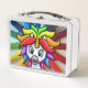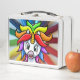 Esta caja de almuerzo tiene un unicornio arcoiris encima.