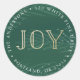 Vestir sus sobres de vacaciones con nuestras etiquetas de la dirección de devolución de vacaciones de las marcas de invierno. Los pegatinas celebran la palabra "Alegría" en Relieve metalizado dorado falso con ramas de pino y nieve sobre un fondo verde. Personalice a los pegatinas agregando su nombre y dirección.