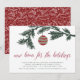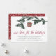 Invite a amigos a celebrar en su nuevo hogar con nuestras invitaciones festivas y modernas para una fiesta de estreno en Navidad. El diseño presenta una rama de pino verde cazador adornada con un adorno de bola roja y verde, y "nuevo hogar para las fiestas" en letras de caligrafía roja. Agregue los detalles de su fiesta de estreno en letras verdes cazador.