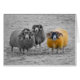 Tres Rams escoceses posando para la cámara. Dos ovejas negras y blancas con un solo carnero de color amarillo-naranja con cuernos muy curados.