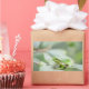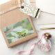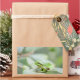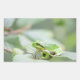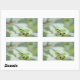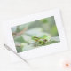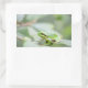 Pegatina rectangular de una rana arbórea europea verde, arborea de la foto del hyla, sentándose en las hojas que crean un fondo verde. Admitido los Países Bajos.