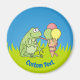 La rana sonriente roba un cono de helado con su lengua. Texto personalizado.
