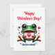 Una rana verde brillante y adorable sentada sosteniendo una tarjeta del día de San Valentín, rodeada de corazones pequeños y lindos. Las palabras "¡Feliz día de San Valentín de parte de la rana!" están escritas de manera juguetona con letras divertidas encima de la rana.