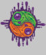ilustracion personalizado de ranas verdes y naranjas enrolladas en un símbolo trippy de yin yang. Etiquetas: rana, yin, yang, trippy, treefrog, anfibio, animal, sapo, yinyang, yin-yang, árbol, veneno, flecha, dardo, personalizado, verde, naranja, morado, goteo, gota, lengua, líquido, lindo, símbolo