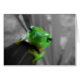 Rana verde brillante sobre un fondo blanco y negro posando para la cámara.