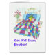 Una tarjeta Get Well para personalizar para un hijo, con una rana verde, tendida en la cama con una botella de agua caliente y medicinas, uvas y flores por todo su alrededor, de un capricho ilustracion pintado a mano por Judy Adamson. Puede cambiar el mensaje interno si lo desea.