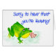 Una pequeña rana verde linda está limpiando sus rasgones con un pañuelo rojo y blanco manchado porque está triste que usted se está yendo; de un ilustracion del watercolour de Judy Adamson. El interior se deja en blanco para su propio mensaje y otras tarjetas y regalos con las ranas están disponibles en mi tienda.