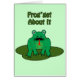 Una rana verde personalizado sentada en una almohadilla de lirio con la lengua fuera. El texto de arriba dice "Frog'get About It"