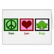 Adorable ranita verde al lado de una señal de paz y un corazón rojo en una linda tarjeta de amante de la rana. Ranas de amor por la paz.