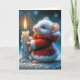 Un pequeño ratón con un abrigo rojo de invierno sostiene una vela rodeada de copos de nieve que caen suavemente