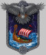 Esta obra de arte de la nave nórdica Viking Mythology presenta un antiguo barco de mitología escandinava nórdica y un cuervo que vuela sobre él.