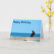 Un cuervo negro mira con cautela, encaramado sobre una valla de madera frente al océano azul. Cumpleaños Feliz de Mensaje