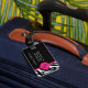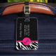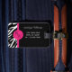 Viaje en estilo con nuestra etiqueta personalizada del equipaje de la raya de la cebra del monograma que la cebra blanca de las características raye y una frontera rosada del acento en un fondo negro con un marco rosado redondo del acento para sus iniciales y su información sobre el frente. La parte posterior de la etiqueta del equipaje ofrece las rayas blancas de la cebra en un fondo negro. Una manera fresca y de la diversión de adornar y de identificar su equipaje. Muestre su personalidad con esta diversión y etiqueta de moda del equipaje. Hace un gran regalo para todas las ocasiones. Personalizar con su información personal o del negocio. Haga clic el "personalizar él!" ¡abotone para cambiar el tamaño de fuente, el color de la fuente, el estilo de fuente y más!