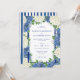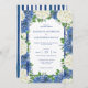 Invite a sus invitados con estilo usando esta elegante invitación a la boda. Nuestra Invitación a la Boda de las Bandas Azules de Hidrangeas Blancas incluye hermosas hortensias azules y blancas, exuberante vegetación y rayas azules clásicas. La armoniosa mezcla de belleza floral y diseño intemporal capta el romanticismo y la sofisticación de su día especial. Prepárate para ser arrastrado por la belleza de esta invitación floral a la boda, que marca el tono perfecto para una celebración inolvidable.