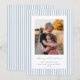 Una clásica tarjeta de vacaciones plana con rayas azules pálidas y blancas, un mensaje de 'Feliz Navidad' en una fuente de pluma de tinta tradicional con texto totalmente personalizable debajo, y una foto. La parte posterior tiene el mismo patrón de rayas, pero se puede cambiar fácilmente por una foto si lo prefiere. Disponible en diferentes colores y con diferentes mensajes de vacaciones en mi tienda.