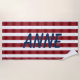 Serie, de planchas abstractas, apiladas para formar, rayas anchas, en tonos desvanecidos de, rojo, rosa, azul y negro, contra blanco, fondo-con tu elección de Monograma, en azul marino.
