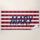 Serie, de planchas abstractas, apiladas para formar, rayas anchas, en tonos desvanecidos de, rojo, rosa, azul y negro, contra blanco, fondo-con tu elección de Monograma, en azul marino.