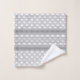 La característica de las toallas del baño y de mano pintó lirios en sombras del gris con los tendrils y las hojas acodadas sobre un gris y un blanco comprobaron el fondo. Su opción de visualizaciones de texto en una escritura blanca bonita sobre una banda horizontal semitransparente en la toalla de baño. El paño del lavado tiene rayas en sombras diversas del gris sobre un fondo comprobado. Ilustraciones y diseño por Karlajkitty