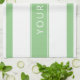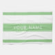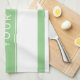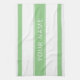 Rayas verdes con toallas de cocina personalizadas. Rayas de centro verde con tu nombre de campo de texto en blanco y con paneles de rayas exteriores verdes sobre un fondo blanco.