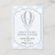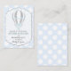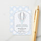 Un polka-punto azul y blanco bebé con globo de aire caliente con acentos de purpurina plateado trae un diseño de tarjeta de libro para una ducha de bebé.