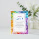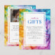 Presentamos la tarjeta del recinto de la "Ethereal Bloom Collection", una elegante adición que transmite cuidadosamente los sentimientos de la pareja sobre las preferencias de regalo mientras mejora el encanto y la elegancia de su celebración. La leyenda "A Note on Gifts" da un toque cálido y acogedor, invitando a los clientes a tener en cuenta los deseos de la pareja con cuidado. Debajo de esto, una sutilmente sugerencia indica el enfoque preferido de la pareja para los regalos, invitados motivadores a celebrar su unión de una manera que se ajuste a los deseos de la pareja. Esto garantiza que los huéspedes se sientan valorados e incluidos en el viaje de la pareja respetando sus deseos. En la parte trasera de la tarjeta, un fondo blanco sereno, enmarcado por los vibrantes remolinos de tintas alcohólicas en tonos azules, morados, rojos, naranjas y verdes, ofrece un bello contraste con el diseño colorido del frente. Este espacio es perfecto para una foto cautivadora de la pareja, añadiendo un toque personal e infundiendo la tarjeta con su historia de amor única. Alrededor de la imagen, la pareja dispone de un amplio espacio para escribir un mensaje de gratitud y amor sincero a sus queridos invitados, expresando su aprecio por la presencia y el apoyo de sus seres queridos, creando así un recuerdo duradero de su día especial. Como parte de la "Colección Ethereal Bloom", esta tarjeta de gabinete no sólo sirve como una herramienta práctica de comunicación sino también como un reflejo del estilo de la pareja y la vibrante belleza de su tema elegido. Con su mezcla de elegancia y personalización, esta carta garantiza que cada aspecto de la celebración del boda esté impregnado de calidez, sofisticación y estilo artístico.