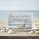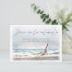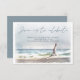 La tarjeta de recepción de boda con tema de playa de California costera presenta una pintura de paisaje marino acuarela de un ave marina Tern volando a lo largo de una playa de Malibú, California (Playa Surfrider) y acentos de escritura a mano modernos. El reverso es azul marino. Personalice con la fecha de su respuesta. Perfecto para bodas de destino costeras, náuticas y tropicales. Parte de mi colección de bodas "Malibú California". Arte por KL Stock.