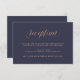 Estas tarjetas de recepción de boda elegantes tienen un rico fondo azul medianoche y un texto de caligrafía moderno en dorado rosa falso que dice "recepción". Esta tarjeta está diseñada para coordinar perfectamente con nuestra colección de bodas "Diamante Geométrico Moderno Minimalista".
